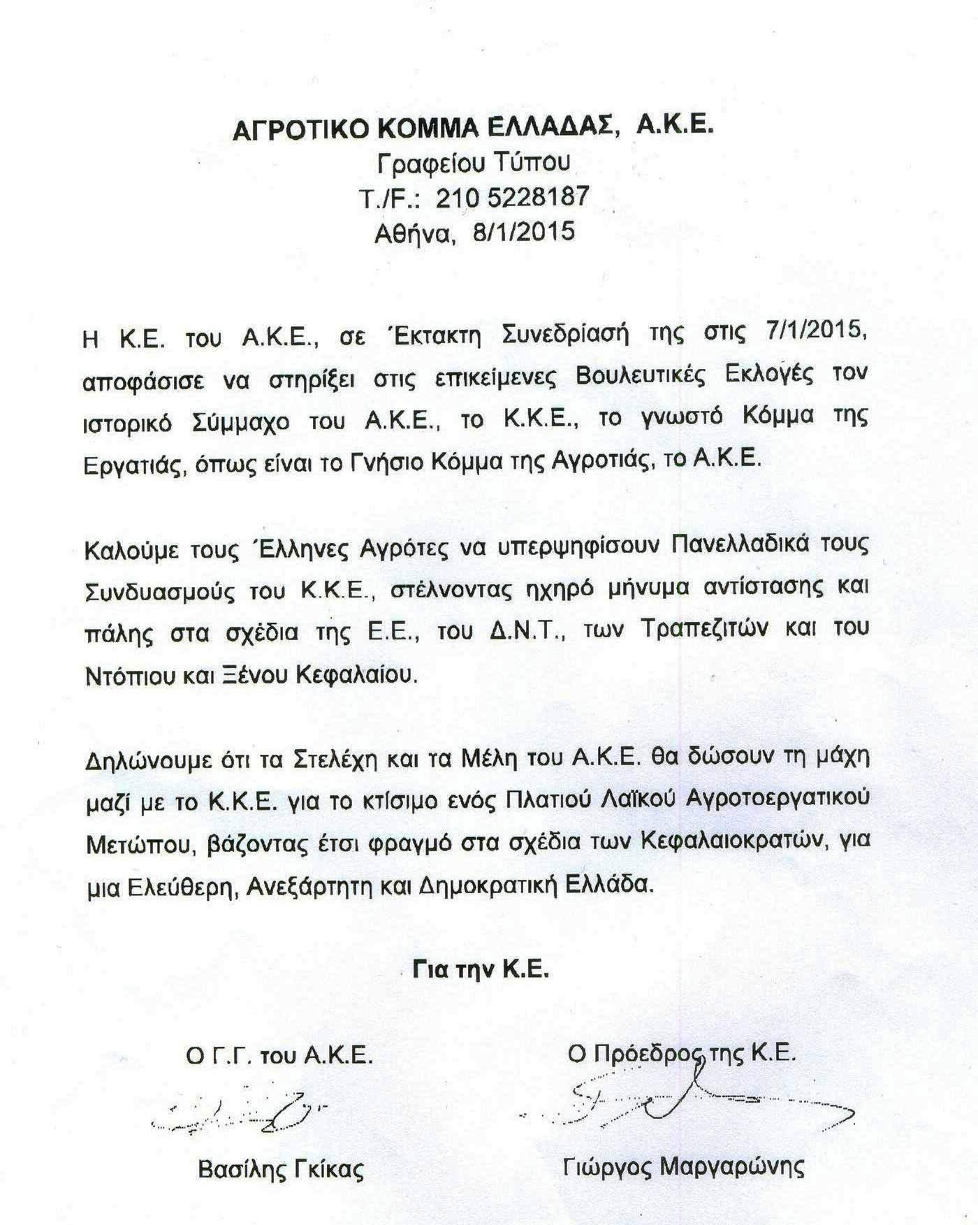 Στην επιστολή του ΑΚΕ, την οποία υπογράφουν ο γγ, Βασίλης Γκίκας και ο πρόεδρος της ΚΕ, Γιώργος Μαργαρώνης, αναφέρεται ότι η απόφαση στήριξης του ΚΚΕ ελήφθη στην έκτακτη συνεδρίαση της ΚΕ του Αγροτικού Κόμματος Ελλάδας, στις 7 Ιανουαρίου 2015. Επίσης, καλούνται οι Έλληνες αγρότες να υπερψηφίσουν πανελλαδικά τους συνδυασμούς του Κομμουνιστικού Κόμματος Ελλάδας «στέλνοντας ηχηρό μήνυμα αντίστασης και πάλης στα σχέδια της ΕΕ, του ΔΝΤ, των τραπεζιτών και του ντόπιου και ξένου κεφαλαίου».