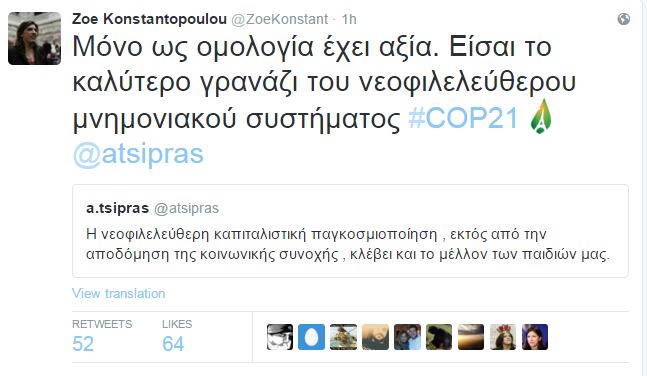“Μόνο ως ομολογία έχει αξία. Είσαι το καλύτερο γρανάζι του νεοφιλελεύθερου μνημονιακού συστήματος” έγραψε πρώην πρόεδρος της Βουλής στο Twitter, σχολιάζοντας την αναφορά του κ. Τσίπρα στο πλαίσιο της Παγκόσμιας Συνόδου για το κλίμα ότι “η νεοφιλελεύθερη καπιταλιστική παγκοσμιοποίηση, εκτός από την αποδόμηση της κοινωνικής συνοχής, κλέβει και το μέλλον των παιδιών μας”.