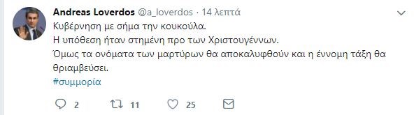Για «κυβέρνηση με σήμα την κουκούλα» κάνει λόγο σε ανάρτησή στο λογαριασμό του στο Twitter ο πρώην υπουργός Υγείας και κοινοβουλευτικός εκπρόσωπος της Δημοκρατικής Συμπαράταξης, Ανδρέας Λοβέρδος.