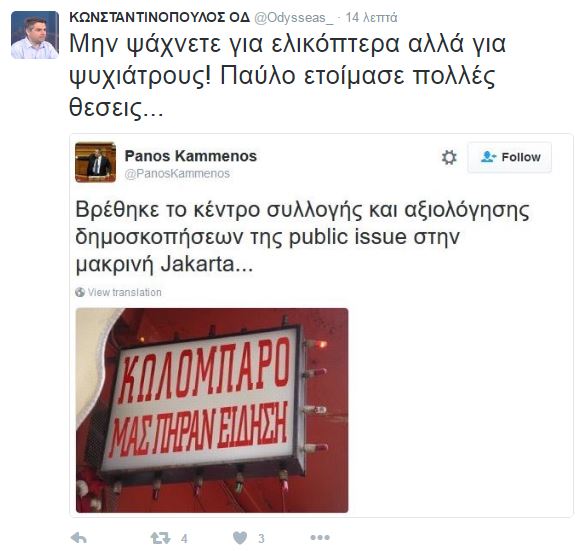Με ένα αιχμηρό tweet σχολίασε την ανάρτηση του Πάνου Καμμένου στο Twitter για τη δημοσκόπηση της Public Issue ο βουλευτής του ΠΑΣΟΚ, Οδυσσέας Κωνσταντινόπουλος.