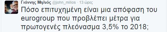 «Πόσο επιτυχημένη είναι μια απόφαση του eurogroup που προβλέπει μέτρα για πρωτογενές πλεόνασμα 3,5% το 2018;» έγραψε ο κ. Μηλιός.