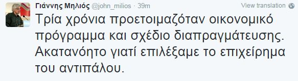 Μέσω του λογαριασμού του στο twitter σχολίασε την κυβερνητική πολιτική ο Γιάννης Μηλιός, μέλος της κεντρικής επιτροπής του ΣΥΡΙΖΑ. Ο κ. Μηλιός, ο οποίος είχε διατελέσει υπεύθυνος οικονομικής πολιτικής του ΣΥΡΙΖΑ, σημείωσε οτι επί τρια χρόνια προετοιμαζόταν οικονομικό σχέδιο και σχέδιο διαπραγμάτευσης, ωστόσο η κυβερνητική πολιτική που επιλέχθηκε, ήταν διαφορετική: