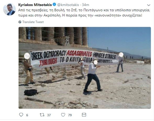 Με αιχμηρό τρόπο σχολίασε την παρέμβαση που πραγματοποίησαν μέλη του Ρουβίκωνα στον ιερό βράχο της Ακρόπολης σχολίασε σε ανάρτησή του στο Twitter ο πρόεδρος της ΝΔ, Κυριάκος Μητσοτάκης.