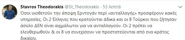 “Όσοι υιοθετούν την άποψη Ερντογάν περί «ανταλλαγής» προσφέρουν κακές υπηρεσίες. Οι 2 Έλληνες που κρατούνται άδικα και οι 8 Τούρκοι που ζήτησαν άσυλο ΔΕΝ είναι αιχμάλωτοι για να ανταλλαγούν. Οι 2 πρέπει να ελευθερωθούν και οι 8 να συνεχίσουν να προστατεύονται από ενα κράτος δικαίου”.