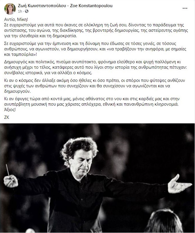 Με μία συγκινητική ανάρτηση στο facebook αποχαιρέτησε η Ζωή Κωνσταντοπούλου τον Μίκη Θεοδωράκη, ο οποίος πέρασε σήμερα στην αιωνιότητα.