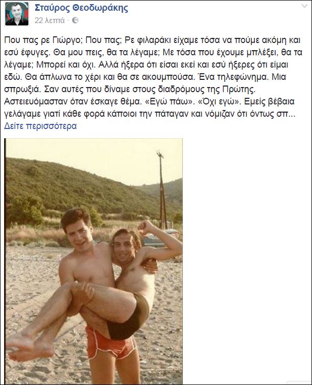 Με μία συγκινητική ανάρτηση στον προσωπικό του λογαριασμό στο facebook, ο επικεφαλής του Ποταμιού, Σταύρος Θεοδωράκης, αποχαιρέτησε τον φίλο του δημοσιογράφο, Γιώργο Γεωργιάδη, ο οποίος έφυγε σήμερα από τη ζωή.