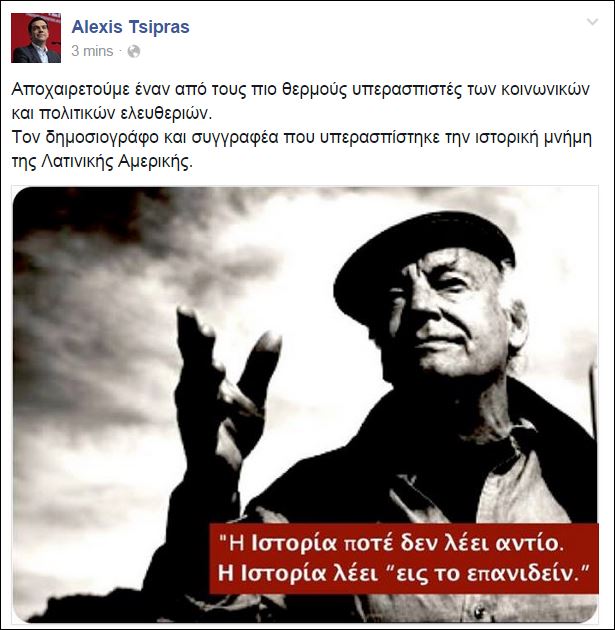 Με μια φωτογραφία και μια φράση του Εντουάρντο Γκαλεάνο, που ανέβασε στον προσωπικό του λογαριασμό στο Facebook, αποχαιρετά ο Αλέξης Τσίπρας τον Ουρουγουανό δημοσιογράφο και συγγραφέα.