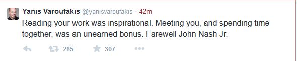 Με μία ανάρτηση στο Twitter, αποχαιρέτησε ο υπουργός Οικονομικών, Γιάνης Βαρουφάκης, τον διάσημο μαθηματικό, Τζον Νας, που έχασε τη ζωή του σε τροχαίο. Συγκεκριμένα, ο κ. Βαρουφάκης, έγραψε: «Να διαβάζω το έργο σου, ήταν για εμένα έμπνευση. Το γεγονός ότι σε συνάντησα και πέρασα χρόνο μαζί σου, ήταν ένα ανεκτίμητο όφελος. Αντίο Τζον Νας».