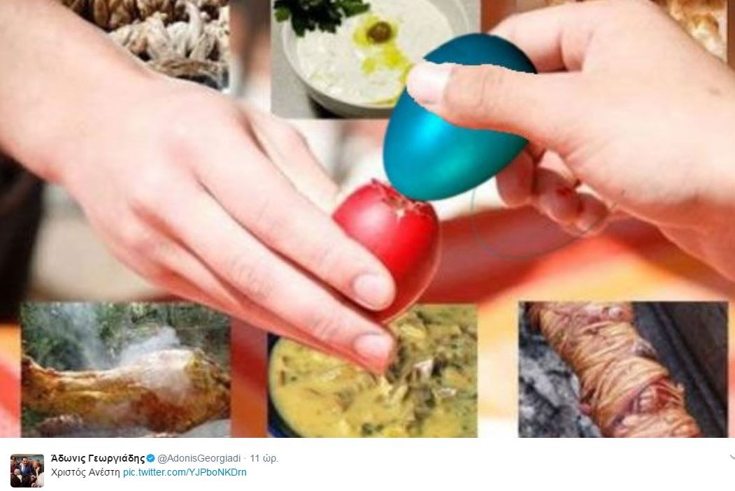 Με ένα συμβολικό τρόπο ευχήθηκε «Χριστός Ανέστη» ο αντιπρόεδρος της Νέας Δημοκρατίας, Άδωνις Γεωργιάδης.Συγκεκριμένα, στον προσωπικό του λογαριασμό στο twitter ανήρτησε μια φωτογραφία με δύο χέρια να τσουγκρίζουν δύο αυγά. Ωστόσο, ο πολιτικός συμβολισμός έγκειται στο ποιο αυγό σπάει ποιο. Όπως, βλέπετε στη φωτογραφία του κ. Γεωργιάδη, το μπλε αβγό… κερδίζει στο τσούγκρισμα, καθώς το κόκκινο σπάει, με τον κ. Γεωργιάδη να κάνει με αυτόν τον τρόπο μία προφανή αναφορά στη ΝΔ και τον ΣΥΡΙΖΑ.