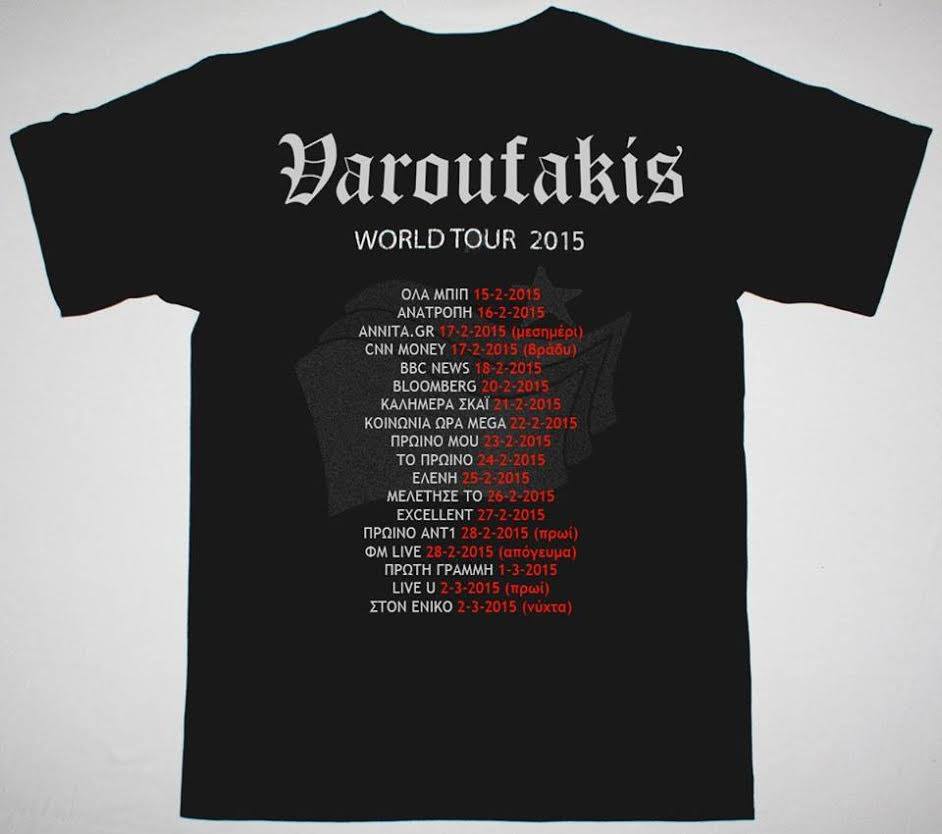 Στην μπλούζα αναγράφεται με μεγάλα γράμματα το όνομα του υπουργού Οικονομικών Γιάνη Βαρουφάκη και από κάτω “World Tour 2015”, δηλαδή παγκόσμια περιοδεία για το 2015.
