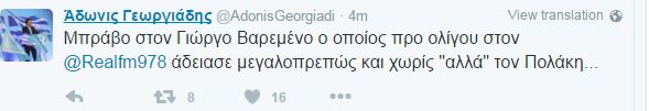 “Μπράβο στον Γιώργο Βαρεμένο ο οποίος προ ολίγου στον Realfm 97,8 άδειασε μεγαλοπρεπώς και χωρίς “αλλά” τον Πολάκη…” έγραψε ο κ. Γεωργιάδης.