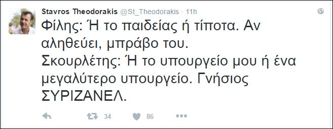 «Φίλης: Ή το παιδείας ή τίποτα. Αν αληθεύει, μπράβο του. Σκουρλέτης: Ή το υπουργείο μου ή ένα μεγαλύτερο υπουργείο. Γνήσιος ΣΥΡΙΖΑΝΕΛ».