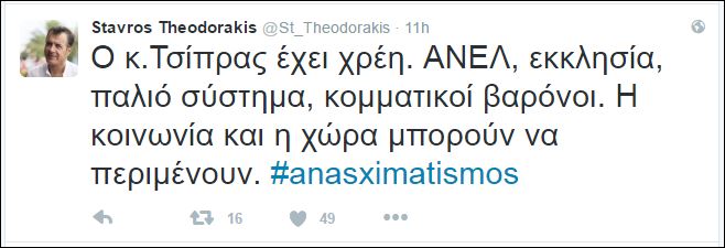 «Ο κ.Τσίπρας έχει χρέη. ΑΝΕΛ, εκκλησία, παλιό σύστημα, κομματικοί βαρόνοι. Η κοινωνία και η χώρα μπορούν να περιμένουν» έγραψε ο κ. Θεοδωράκης και συνέχισε σε επόμενο tweet: