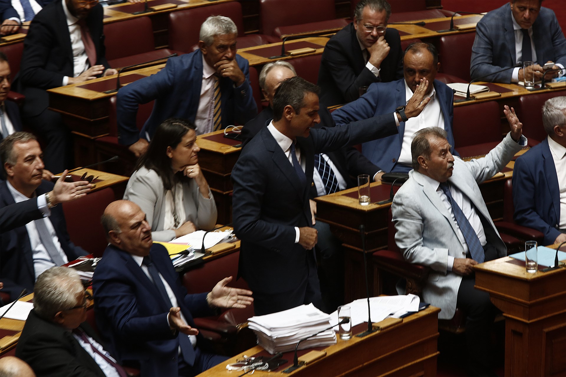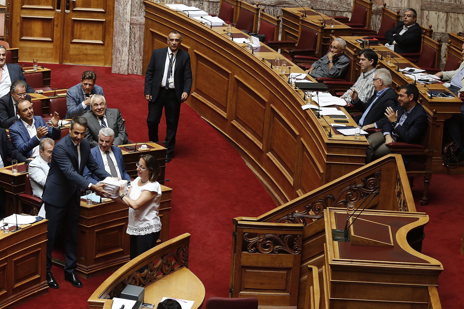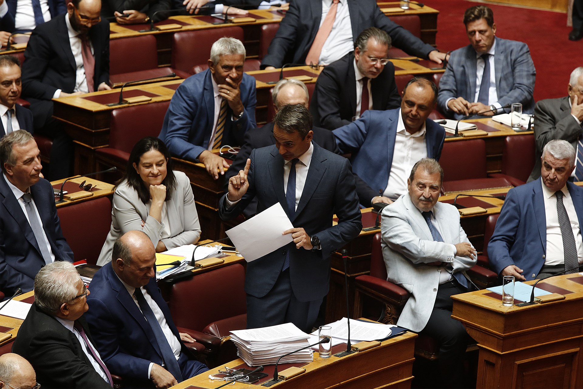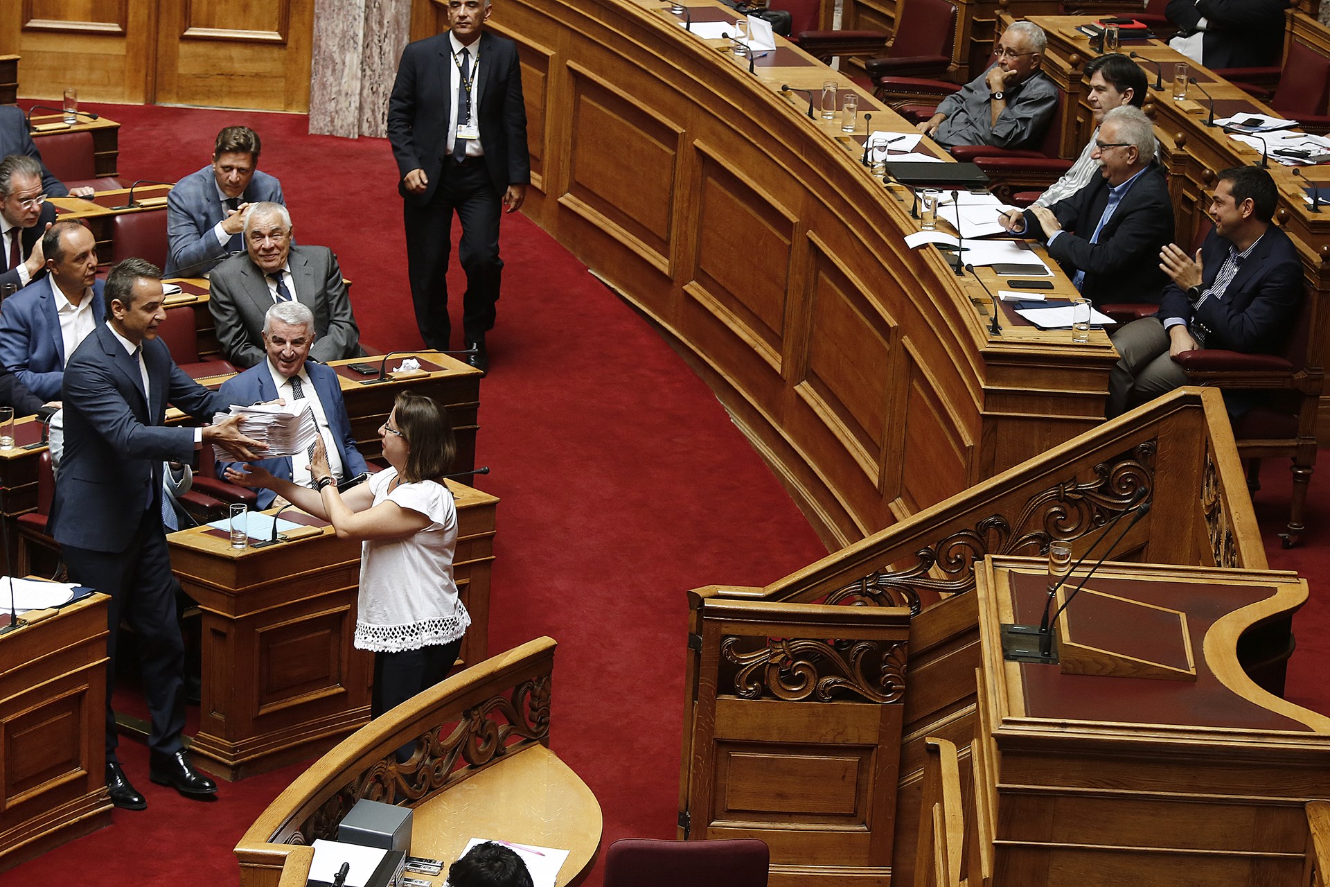 “Να ‘τες, εδώ πέρα. Ζήτησα από τους συνεργάτες μου να τις τυπώσουν, κύριε πρόεδρε, και να τις καταθέσω, παρακαλώ στα πρακτικά”, είπε ο κ. Μητσοτάκης.