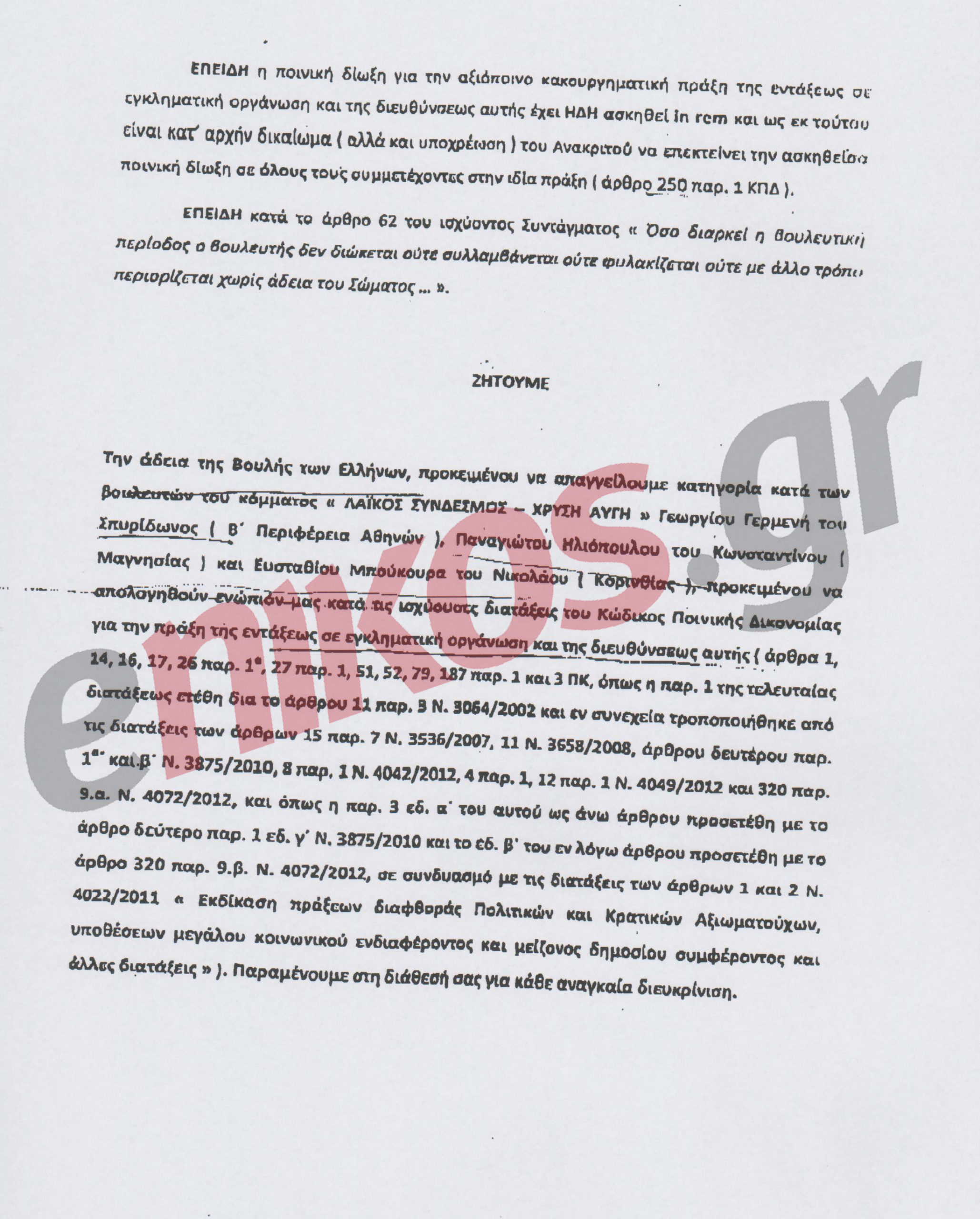 Στο διαβιβαστικό αναφέρεται επίσης ότι “ζητείται η άδεια της Βουλής των Ελλήνων, προκειμένου να απαγγείλουμε κατηγορία κατά των βουλευτών του κόμματος “ΛΑΪΚΟΣ ΣΥΝΔΕΣΜΟΣ-ΧΡΥΣΗ ΑΥΓΗ” Γεωργίου Γερμανή, Παναγιώτη Ηλιόπουλου και Ευστάθιου Μπούκουρα προκειμένου να απολογηθούν κατά τις ισχύουσες διατάξεις του Κώδικος Ποινικής Δικονομίας για την πράξη της εντάξεως σε εγκληματική οργάνωση και διευθύνσεως αυτής”.