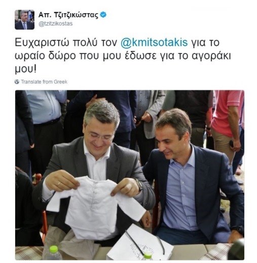 Ο Απόστολος Τζιτζικώστας ανέβασε τη φωτογραφία στο twitter γράφοντας: «Ευχαριστώ πολύ τον Κυριάκο Μητσοτάκη για το ωραίο δώρο που μου έδωσε για το αγοράκι μου!»