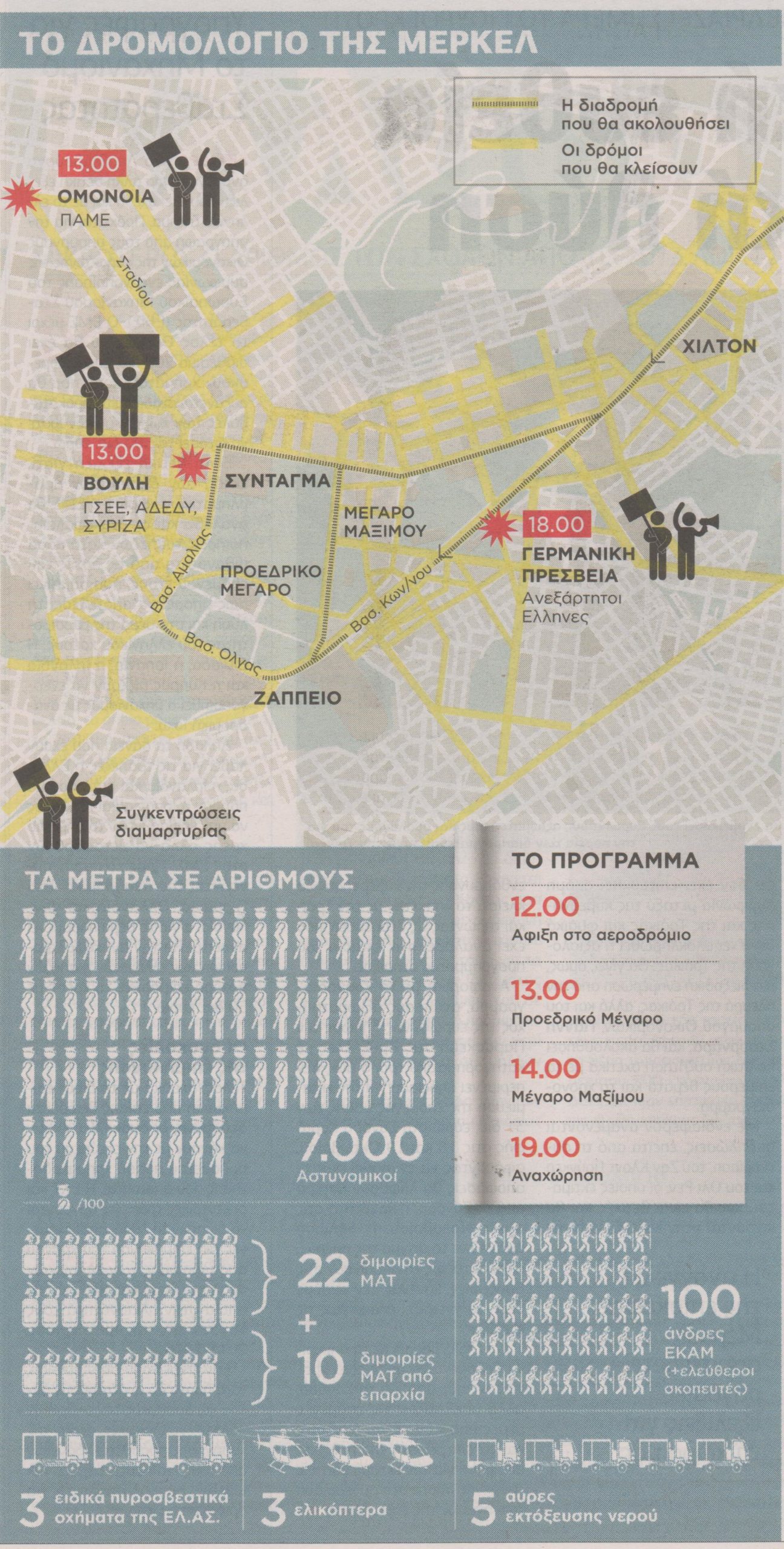 Γράφημα στο οποίο απεικονίζονται αναλυτικά η διαδρομή της Μέρκελ, οι κλειστοί δρόμοι, τα μέτρα ασφαλείας και το αυριανό πρόγραμμα της Καγκελαρίου.