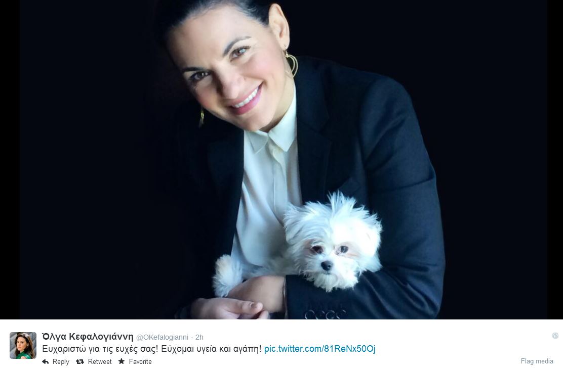 Ανήμερα της ονομαστικής της εορτής η Όλγα Κεφαλογιάννη δέχθηκε ευχές στα social media. Η υπουργός Τουρισμού, απάντησε σε όσους της ευχήθηκαν ανεβάζοντας στο twitter μία φωτογραφία με το σκυλάκι της.