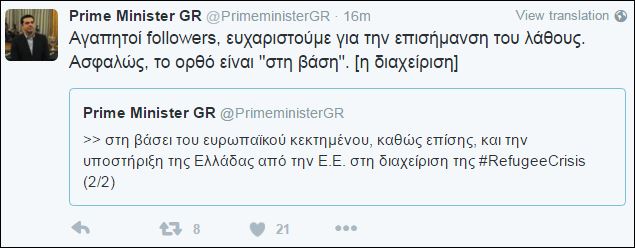 Στη συνέχεια, οι διαχειριστές της σελίδας κοινωνικής δικτύωσης του κ. Τσίπρα έκαναν εκ νέου μια ανάρτηση, αντικαθιστώντας το λάθος και ευχαριστώντας τους followers του Πρωθυπουργού για την επισήμανση.