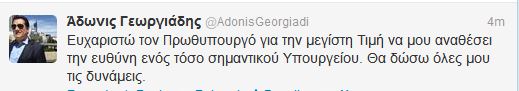 «Ευχαριστώ τον Πρωθυπουργό για την μεγίστη Τιμή να μου αναθέσει την ευθύνη ενός τόσο σημαντικού Υπουργείου. Θα δώσω όλες μου τις δυνάμεις», υποσχέθηκε μέσω Twitter ο νέος υπουργός Υγείας, Άδωνις Γεωργιάδης.