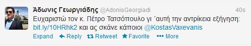 “Ευχαριστώ τον κ. Πέτρο Τατσόπουλο γι’αυτή την αντρίκεια εξήγηση”, έγραψε ο κ. Γεωργιάδης στο Twitter.