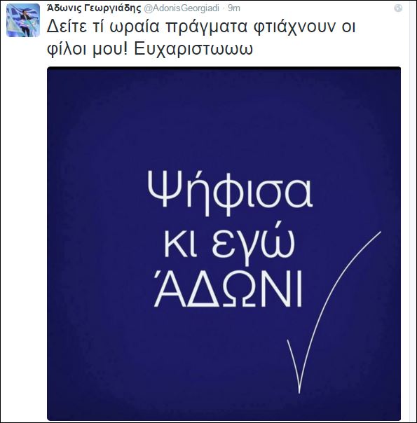 Μέσω του προσωπικού του λογαριασμού στο twitter ο υποψήφιος πρόεδρος της Νέας Δημοκρατίας, Άδωνις Γεωργιάδης ευχαρίστησε τους διαδικτυακούς του φίλους για τη φωτογραφία που έφτιαξαν.
