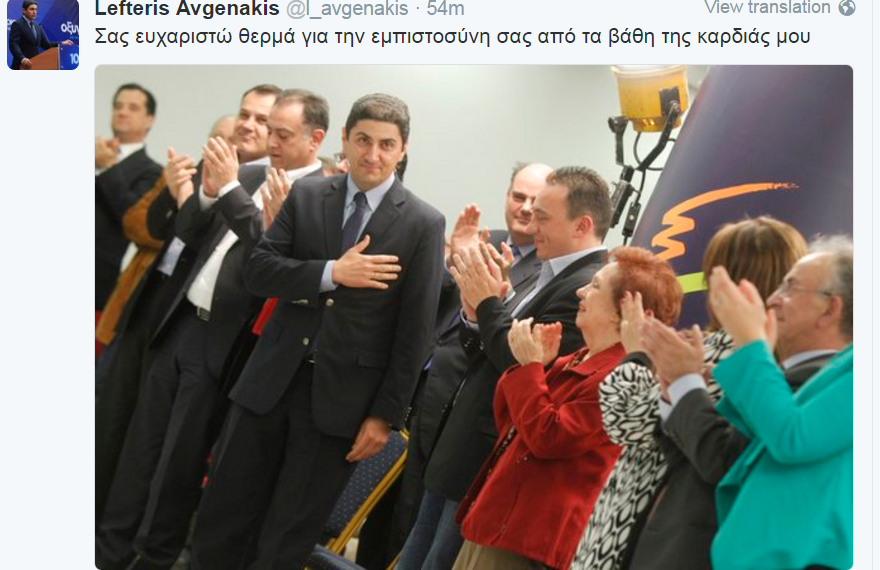 Ο νέος γραμματέας της Πολιτικής Επιτροπής της Νέας Δημοκρατίας, Λευτέρης Αυγενάκης, ευχαρίστησε μέσω twitter όσους τον εμπιστεύτηκαν για τη θέση αυτή.