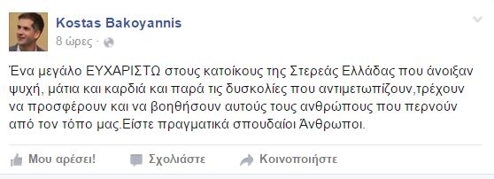 «Ένα μεγάλο ευχαριστώ στους κατοίκους της Στερεάς Ελλάδας που άνοιξαν ψυχή, μάτια και καρδιά και παρά τις δυσκολίες που αντιμετωπίζουν, τρέχουν να προσφέρουν και να βοηθήσουν αυτούς τους ανθρώπους που περνούν από τον τόπο μας. Είστε πραγματικά σπουδαίοι άνθρωποι».