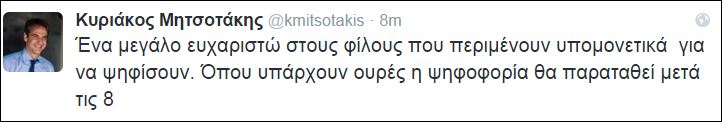 Ο υποψήφιος πρόεδρος της Νέας Δημοκρατίας, Κυριάκος Μητσοτάκης, ευχαρίστησε μέσω twitter, όσους «περιμένουν υπομονετικά για να ψηφίσουν».