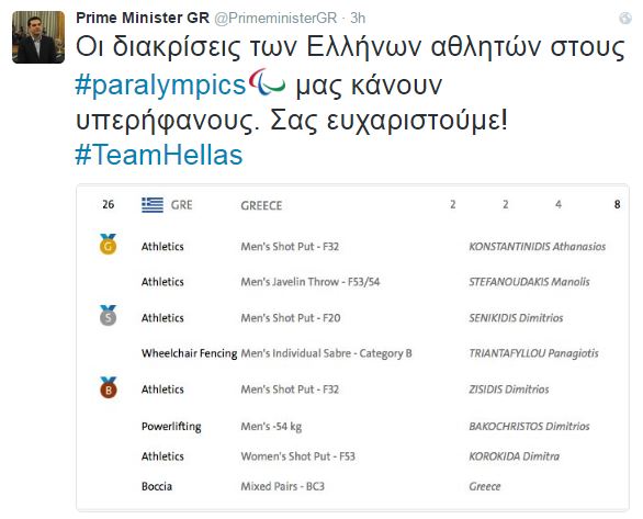Τους Έλληνες αθλητές που συμμετέχουν στους Παραολυμπιακούς Αγώνες ευχαρίστησε ο Πρωθυπουργός Αλέξης Τσίπρας μέσω του λογαριασμού του στο twitter.