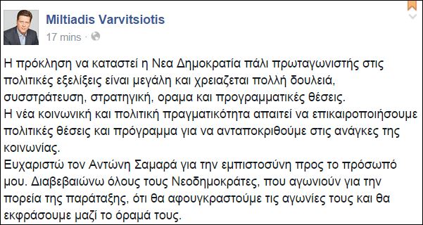 Ευχαριστώ τον Αντώνη Σαμαρά για την εμπιστοσύνη προς το πρόσωπό μου. Διαβεβαιώνω όλους τους Νεοδημοκράτες, που αγωνιούν για την πορεία της παράταξης, ότι θα αφουγκραστούμε τις αγωνίες τους και θα εκφράσουμε μαζί το όραμά τους», έγραψε ο Μιλτιάδης Βαρβιτσιώτης.