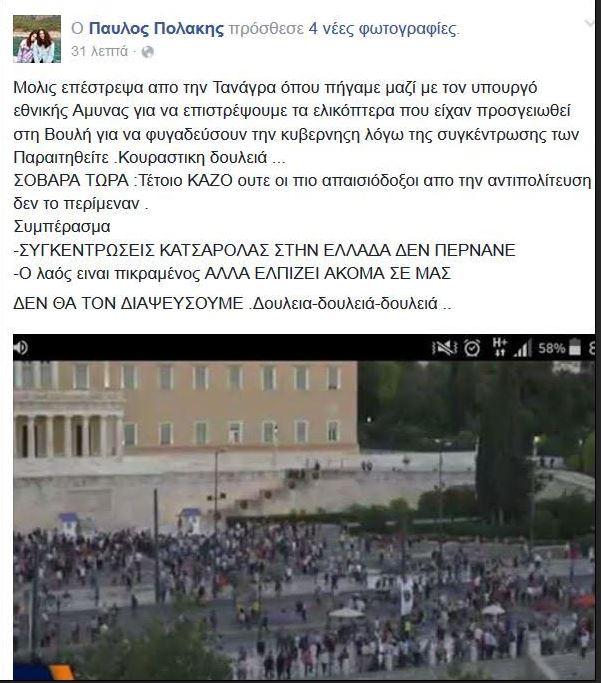 “Μόλις επέστρεψα από την Τανάγρα όπου πήγαμε μαζί με τον υπουργό εθνικής Άμυνας για να επιστρέψουμε τα ελικόπτερα που είχαν προσγειωθεί στη Βουλή για να φυγαδεύσουν την κυβέρνηση λόγω της συγκέντρωσης των Παραιτηθείτε. Κουραστική δουλειά …