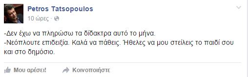 Με μία ειρωνική ανάρτηση στο Facebook, σχολιάζει ο Πέτρος Τατσόπουλος, την πρόταση του βουλευτή του ΣΥΡΙΖΑ, Αλέξανδρου Τριανταφυλλίδη, για δίδακτρα στα δημόσια σχολεία, γράφοντας χαρακτηριστικά: «Νεόπλουτε επιδειξία. Καλά να πάθεις. Ήθελες να μου στείλεις το παιδί σου και στο δημόσιο».