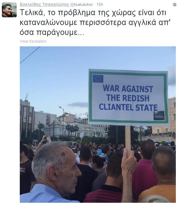 Το πλακάτ έγραφε “War against the redish cliantel state”. Δύο από τις λέξεις ήταν γραμμένες λάθος (το redish γράφεται reddish και το cliantel, clientele) και ο κ. Τσακαλώτος, o οποίος γνωρίζει άριστα την αγγλική γλώσσα, έσπευσε να το σχολιάσει…