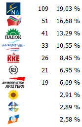 Με ενσωμάτωση που φτάνει στο 96,15% τα ποσοστά των κομμάτων στην επικράτεια διαμορφώνονται αναλυτικά ως εξής: