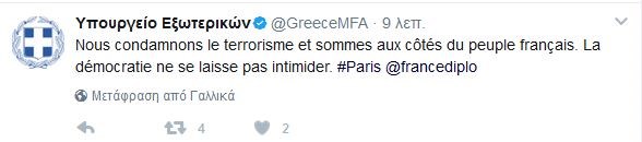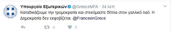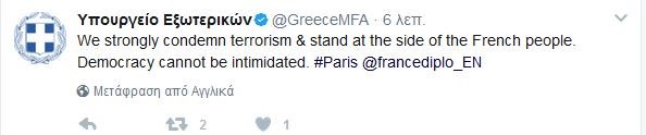 Με ανάρτηση τόσο στα ελληνικά, στα αγγλικά όσο και στα γαλλικά, στο λογαριασμό του στο Twitter το υπουργείο Εξωτερικών καταδικάζει την τρομοκρατική επίθεση στο Παρίσι και εκφράζει την αλληλεγγύη του στον γαλλικό λαό.Στα ελληνικά η ανάρτηση αναφέρει: «Καταδικάζουμε την τρομοκρατία και στεκόμαστε δίπλα στον γαλλικό λαό. Η Δημοκρατία δεν εκφοβίζεται».