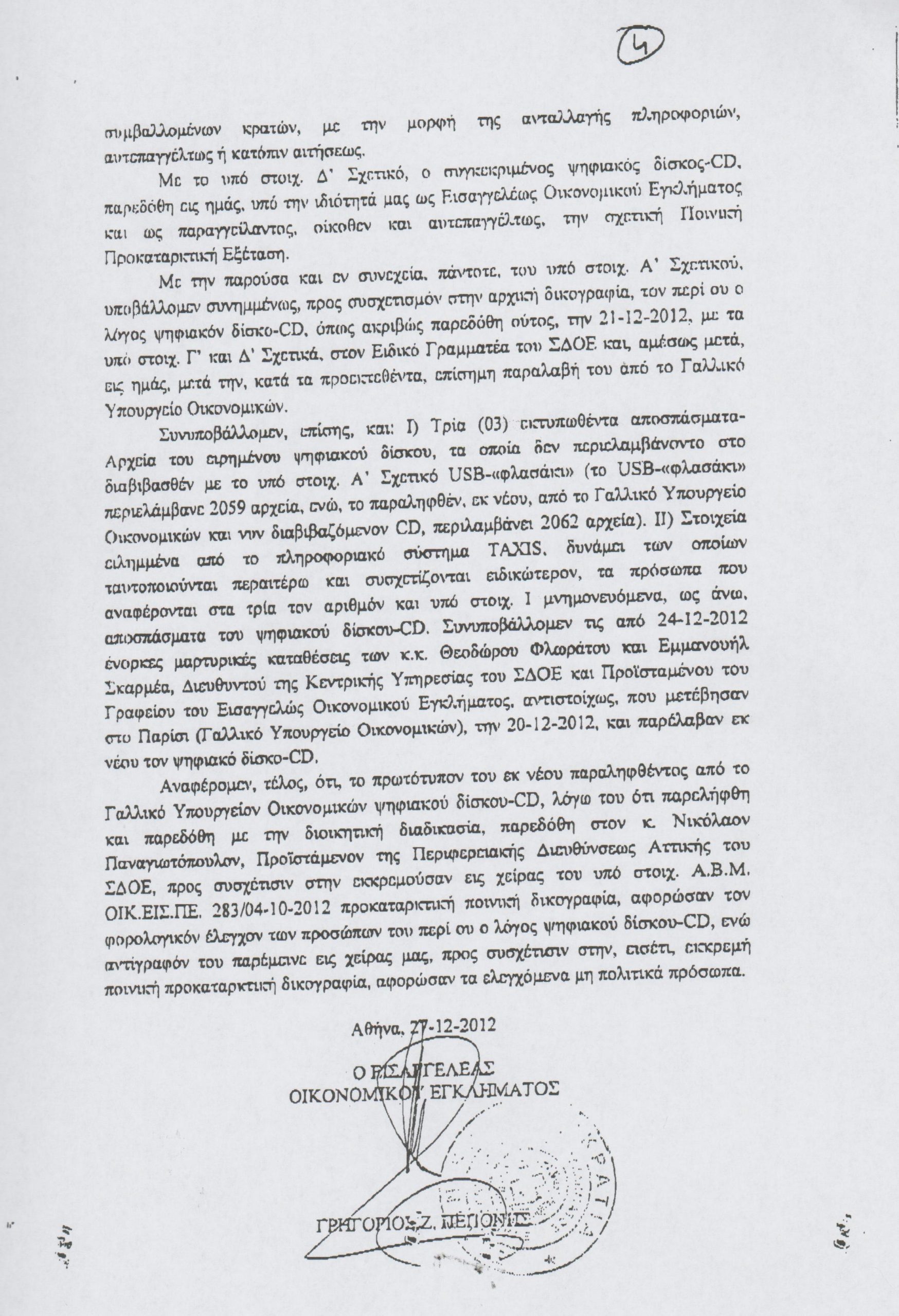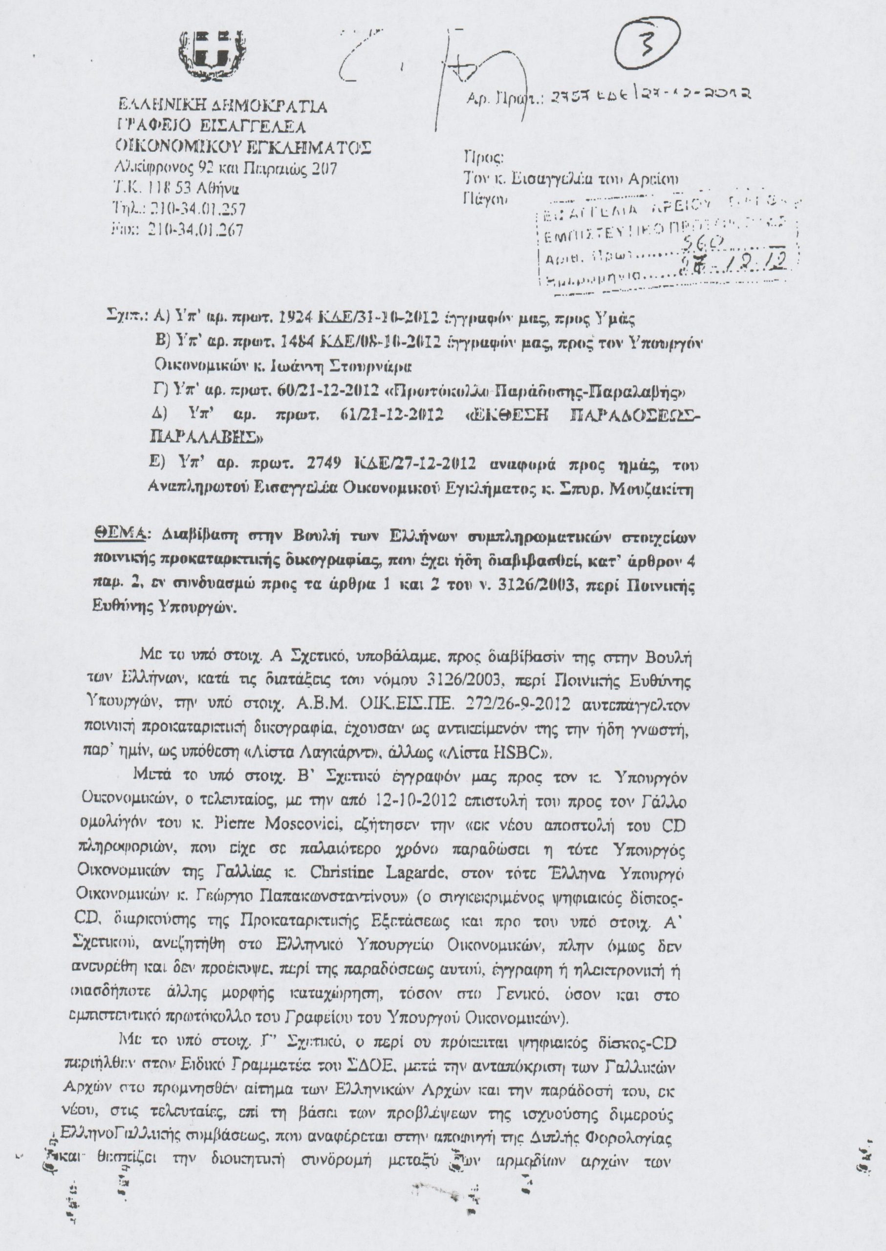 Δείτε το έγγραφο που απέστειλε ο Οικονομικός Εισαγγελέας Γρηγόρης Πεπόνης στη Βουλή αναφορικά με την “λίστα Λαγκάρντ”.