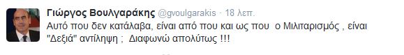 Ο κ.Βουλγαράκης έγραψε στο Twitter: «Αυτό που δεν κατάλαβα, είναι από που και ως που ο Μιλιταρισμός, είναι “Δεξιά” αντίληψη; Διαφωνώ απολύτως !!!».