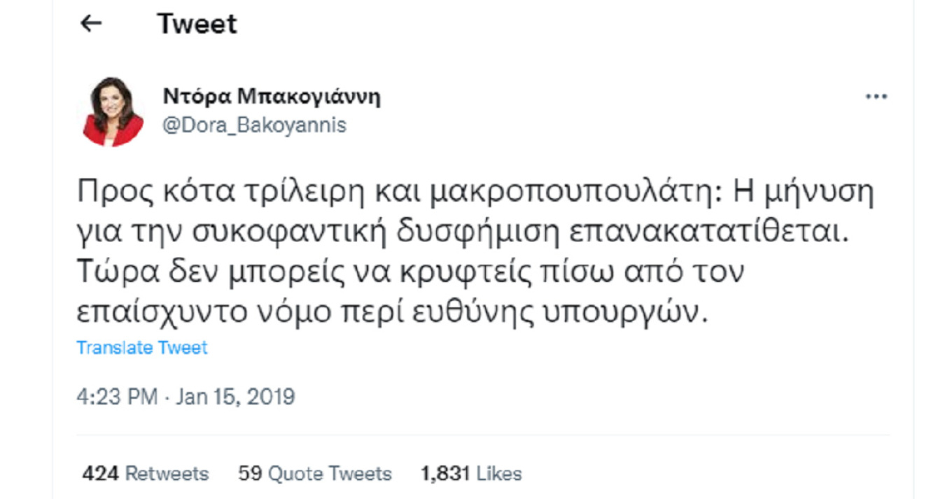 Εξάλλου, «η συμπεριφορά του Π.Κ. έναντι της κ. Μπακογιάννη -η δημοσίευση ενός μηνύματος στο Twitter που εμφανίζεται ως δυσφημιστική- δεν είχε καμιά σχέση με τις δραστηριότητες τις οποίες εκείνος ασκούσε μέσα στο πλαίσιο των υπουργικών ή κοινοβουλευτικών καθηκόντων του», πρόσθεσαν οι δικαστές.