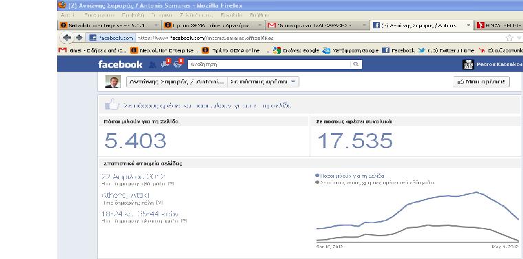 Όταν το facebook χρησιμοποιηθεί ως εργαλείο αποτύπωσης των τάσεων του εκλογικού σώματος, μπορεί να δώσει κάποια πολύ ενδιαφέροντα συμπεράσματα. Επισκεφθήκαμε σήμερα τις προσωπικές σελίδες των αρχηγών των τριών πρώτων κομμάτων και ελέγξαμε την δημοτικότητά τους όπως αυτές διαμορφώνονται μετά τις εκλογές της 6ης Μαΐου. Η σελίδα του Αντώνη Σαμαρά μπορεί να έχει τους περισσότερους φίλους καθώς 17.536 χρήστες του δικτύου έχουν κάνει like στον πρόεδρο της Νέας Δημοκρατίας, το διάγραμμα όμως της δημοτικότητάς του δείχνει μία κατακόρυφη πτώση μετά τις 6 Μαίου.