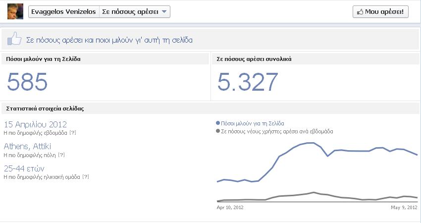 Μία ευθεία γραμμή χαρακτηρίζει τέλος την ιντερνετική δημοτικότητα του Ευάγγελου Βενιζέλου ο οποίος αν και έχει μόνο 5.327 φίλους στο facebook, παραμένει σταθερός στις προτιμήσεις των χρηστών του δικτύου.