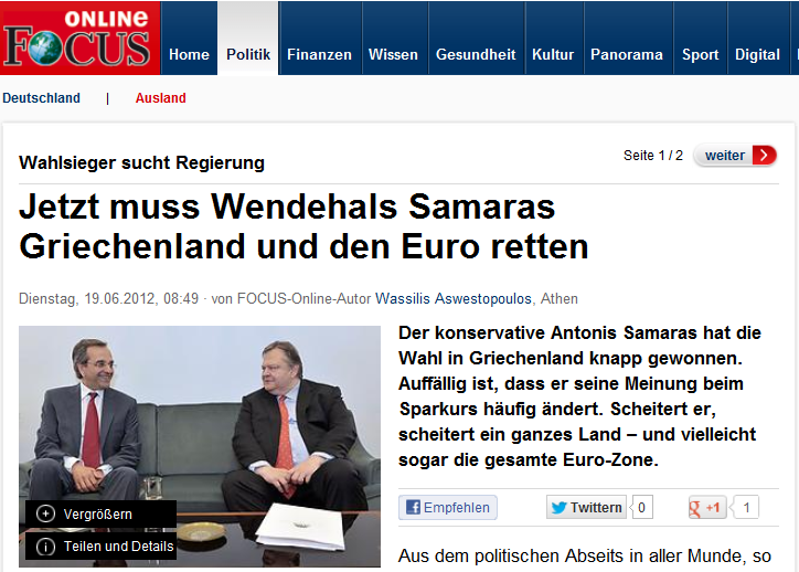 “Τώρα καλείται ο κωλοτούμπας Σαμαράς να σώσει την Ελλάδα και το ευρώ” είναι ο τίτλος σημερινού δημοσιεύματος του γερμανικού περιοδικού Focus, το οποίο γράφει ότι ο “Σαμαράς, που οριακά κέρδισε τις εκλογές, πιστεύει ότι θα αλλάξει το πακέτο λιτότητας. Εάν αποτύχει, θα αποτύχει ολόκληρη η χώρα -ίσως ακόμη και το σύνολο της Ευρωζώνης. Η Ελλάδα ή θα πετύχει ή θα υποστεί τον οικονομικό της θάνατο” σημειώνει το Focus.