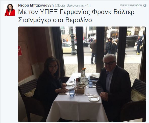 Στη Γερμανία βρίσκεται η βουλευτής της Νέας Δημοκρατίας, Ντόρα Μπακογιάννη, όπου από το πρωί είχε σειρά επαφών με Γερμανούς αξιωματούχους, για το προσφυγικό. Όπως φαίνεται και στη φωτογραφία που ανέβασε στον προσωπικό της λογαριασμό στο Twitter, η Ντόρα Μπακογιάννη, είχε γεύμα εργασίας με τον υπουργό Εξωτερικών της Γερμανίας, Φρανκ-Βάλτερ Σταϊνμάιερ, στο Βερολίνο.