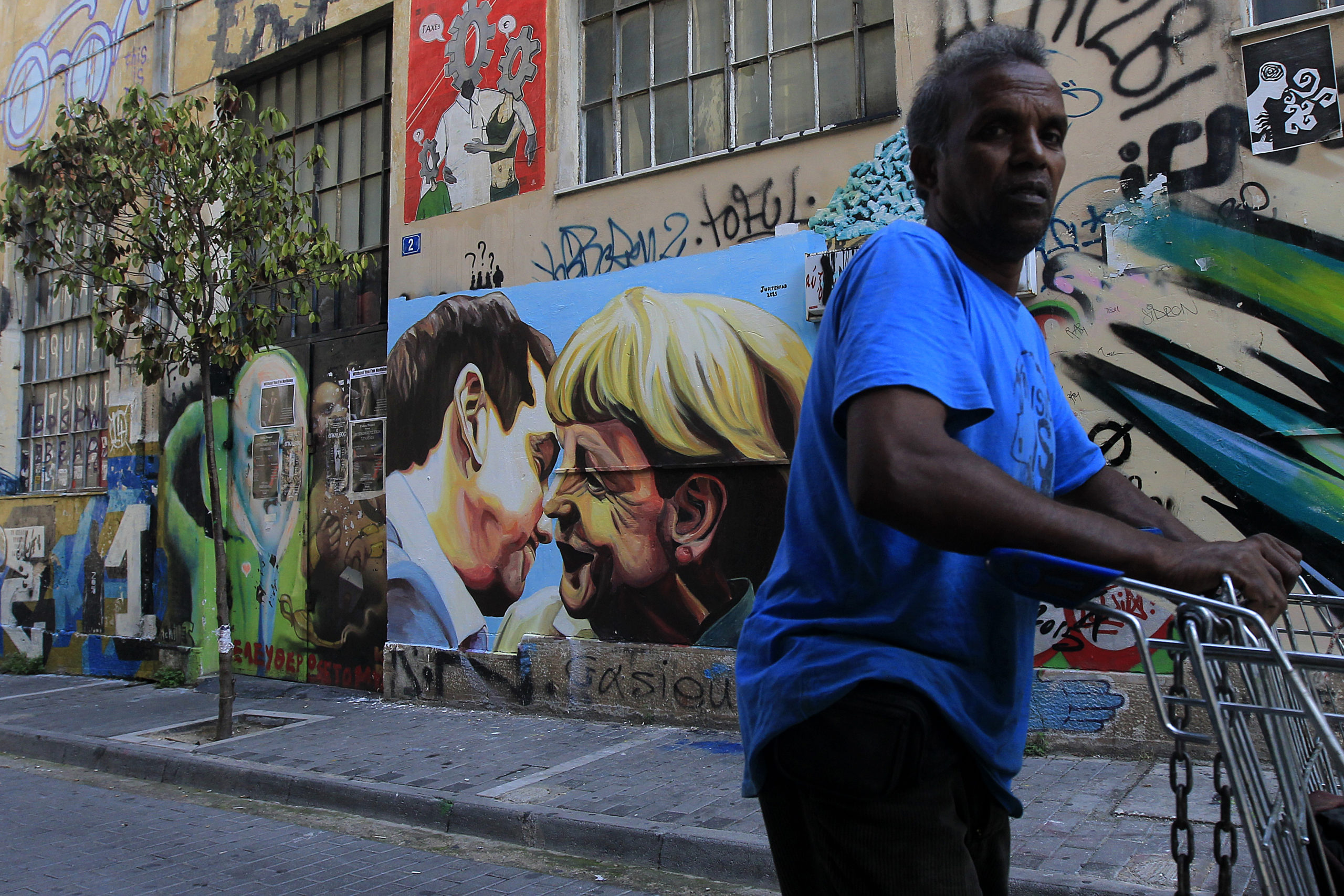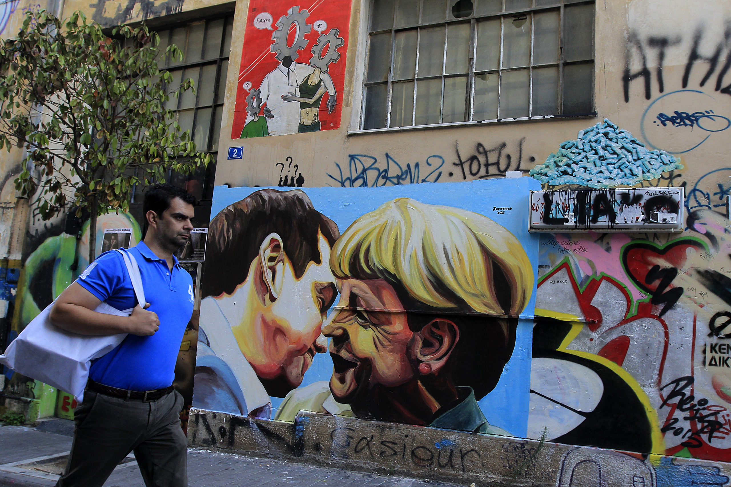Σε έναν τοίχο στο κέντρο της Αθήνας, ο Έλληνας Πρωθυπουργός Άλέξης Τσίπρας και η Γερμανίδα Καγκελάριος Άνγκελα Μέρκελ έρχονται κόντα, σε απόσταση αναπνοής.