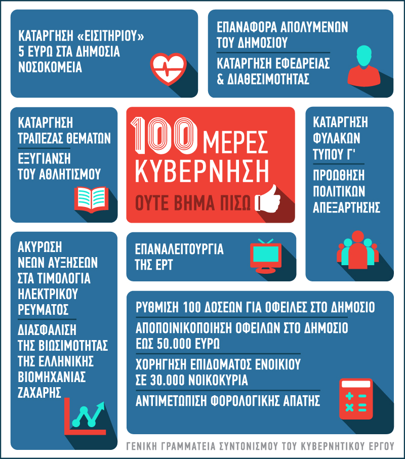 Ένα γράφημα με τα πεπραγμένα της κυβέρνησης τις πρώτες 100 ημέρες από τη νίκη του ΣΥΡΙΖΑ στις εκλογές ανέβασε στον προσωπικό του λογαριασμό στο Facebook ο γενικός γραμματέας συντονισμού του κυβερνητικού έργου, Χριστόφορος Βερναρδάκης.