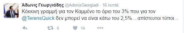 Συγκεκριμένα, ο κ. Γεωργιάδης, έκανε αναφορά στις δηλώσεις του Τέρενς Κουίκ, την Τετάρτη, στον Realfm 97,8 και στον Νίκο Χατζηνικολάου, ότι «το 2,5% είναι όριο ασφαλείας», ενώ παράλληλα έγραψε ότι για τον Πάνο Καμμένο, το όριο του 3%, αποτελεί κόκκινη γραμμή.