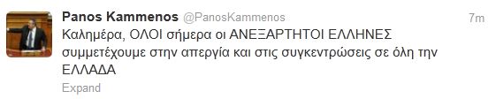Ο πρόεδρος των Ανεξάρτητων Ελλήνων, μέσω του προσωπικού του λογαριασμού στο Twitter καλεί τους Έλληνες να συμμετάσχουν στη σημερινή απεργία: