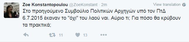 “Στο προηγούμενο Συμβούλιο Πολιτικών Αρχηγών υπό τον Πρόεδρο της Δημοκρατίας 6.7.2015 έκαναν το “όχι” του λαού ναι. Αύριο τι; Για πόσο θα κρύβουν τα πρακτικά;” γράφει στο Twitter η πρώην πρόεδρος της βουλής.