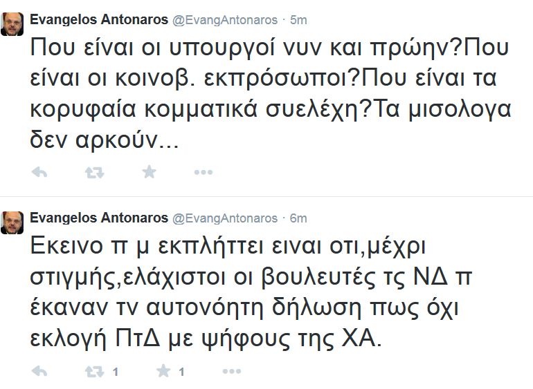 “Εκείνο που με εκπλήσσει είναι ότι, μέχρι στιγμής, ελάχιστοι οι βουλευτές της ΝΔ έκαναν την αυτονόητη δήλωση πως όχι εκλογή ΠτΔ με ψήφους της Χ.Α. Ποιοι είναι οι υπουργοί νυν και πρώην; Που είναι οι κοινοβουλευτικοί εκπρόσωποι; Πού είναι τα κορυφαία κομματικά στελέχη; Τα μισόλογα δεν αρκούν”