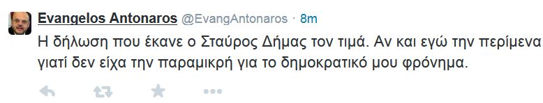 “Η δήλωση που έκανε ο Σταύρος Δήμας τον τιμά. Αν και εγώ την περίμενα γιατί δεν είχα την παραμικρή για το δημοκρατικό του φρόνημα” έγραψε αρχικά ο κυβερνητικός εκπρόσωπος της κυβέρνησης Καραμανλή.